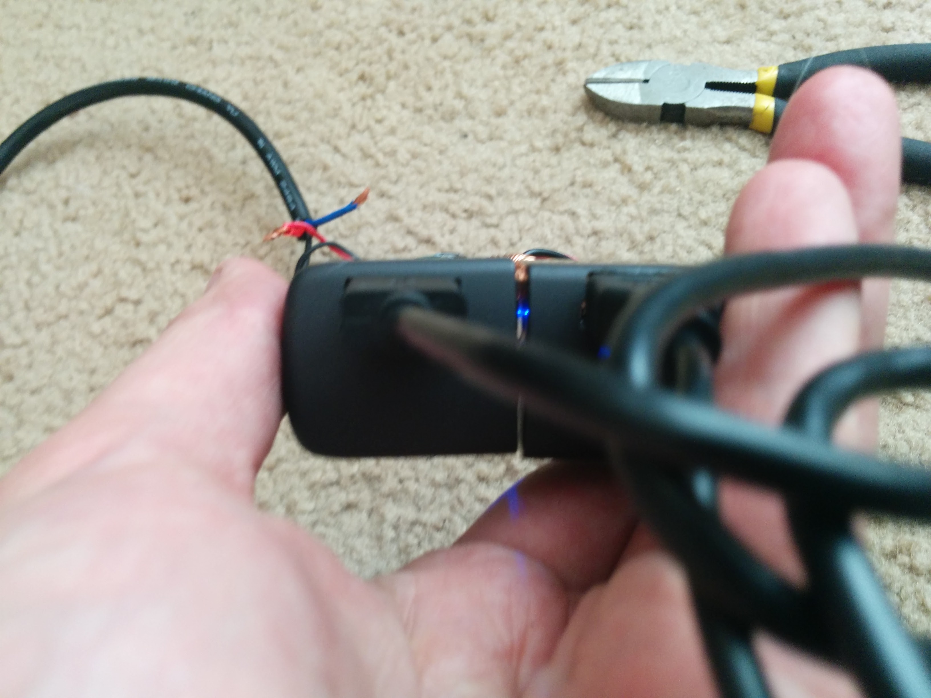 This started out as a dollar store 2.1A dual-port charger in an ugly translucent orange case. I measured it to ensure it worked well under load, examined the boards, and decided that they’d work great to add dedicated charging ports in my daily driver.